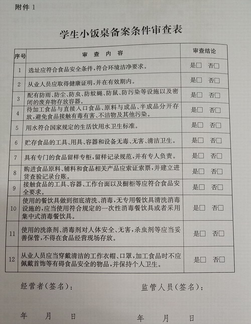 现场备案审查时,监管人员不得少于2人,出示有效证件,说明来意,填写《学生小饭桌备案条件审查表》(见附件1),经学生小饭桌经营者核对无误后,由双方在《学生小饭桌备案条件审查表》上签名或者盖章。学生小饭桌经营者拒绝签名或者盖章的,监管人员应当注明情况,并视为放弃备案。