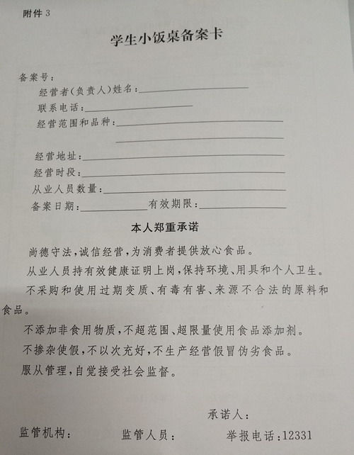 第十五条 旗县级食品药品监督管理部门应当为准予备案的学生小饭桌填写《学生小饭桌详细信息情况表》(见附件2),发放学生小饭桌备案卡(见附件3),并以适当方式予以公示,主动接受社会监督,便于公众查询。